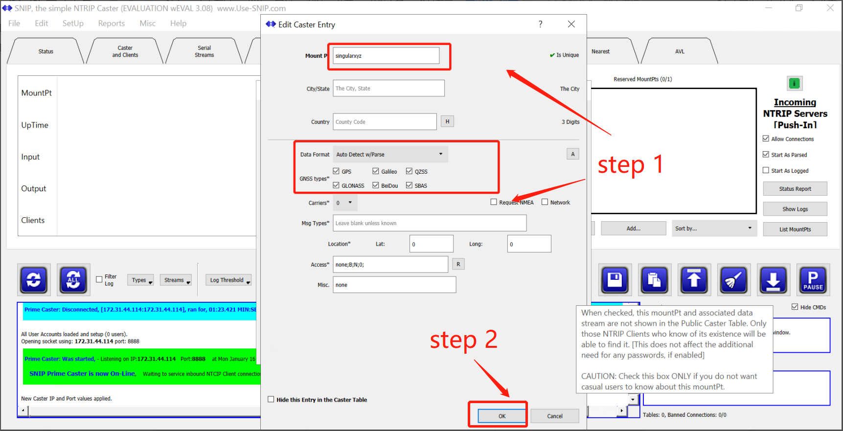 Step 2: Enter all the parameters same as SNIP settings, including the Caster Address (public IP), Port, User, Password and Mount Point. Then select the data type you need and tick Startup. Finally click OK to save all the settings.